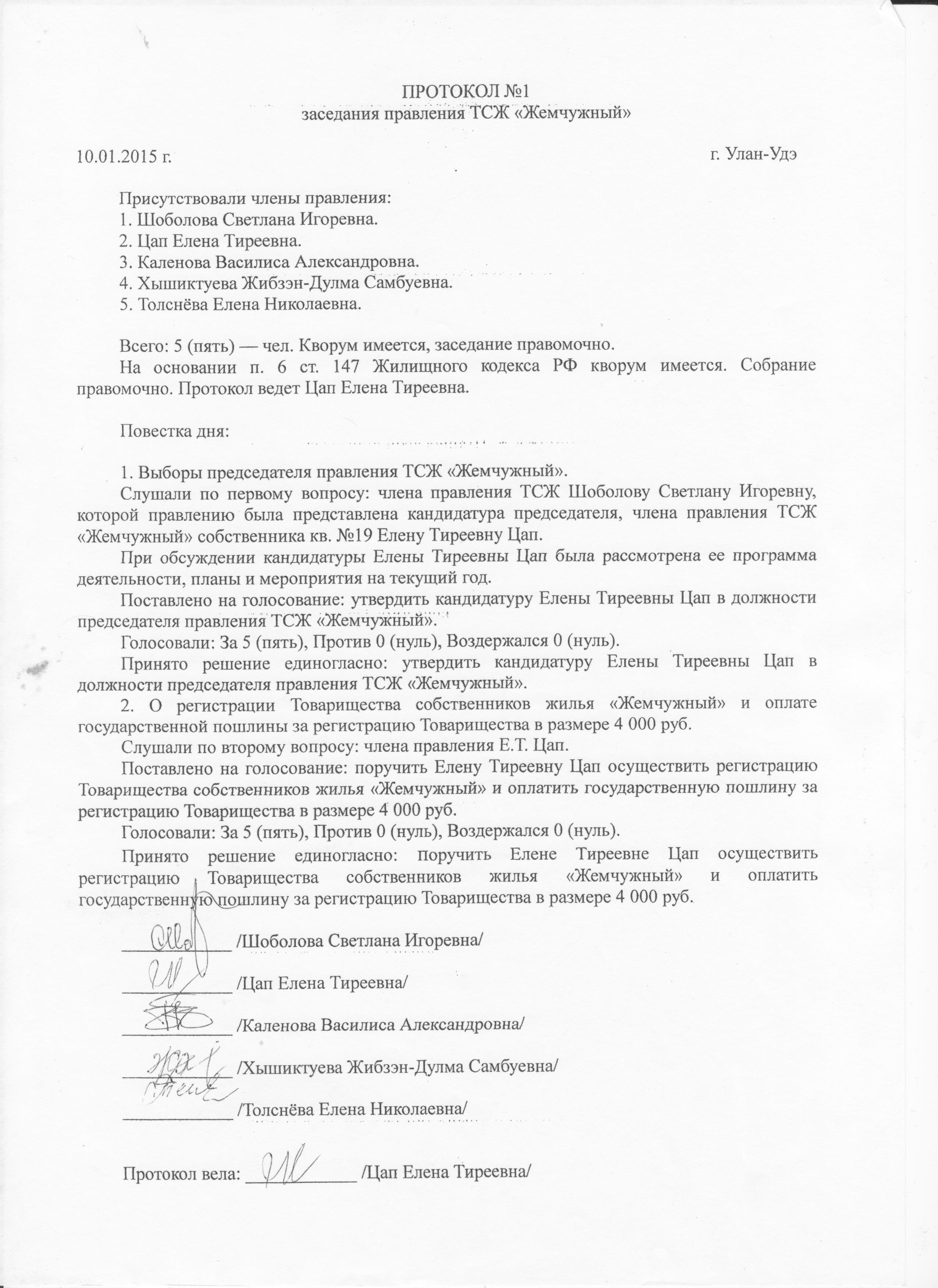 Протокол заседания членов Правления № 1 от 10.01.2015 г. (избрание председателя Правления)